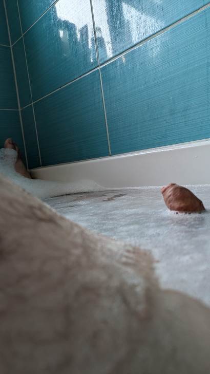 Bath water with bubbles we can see a bit of thigh and the tip of a penis for post called Up Periscope